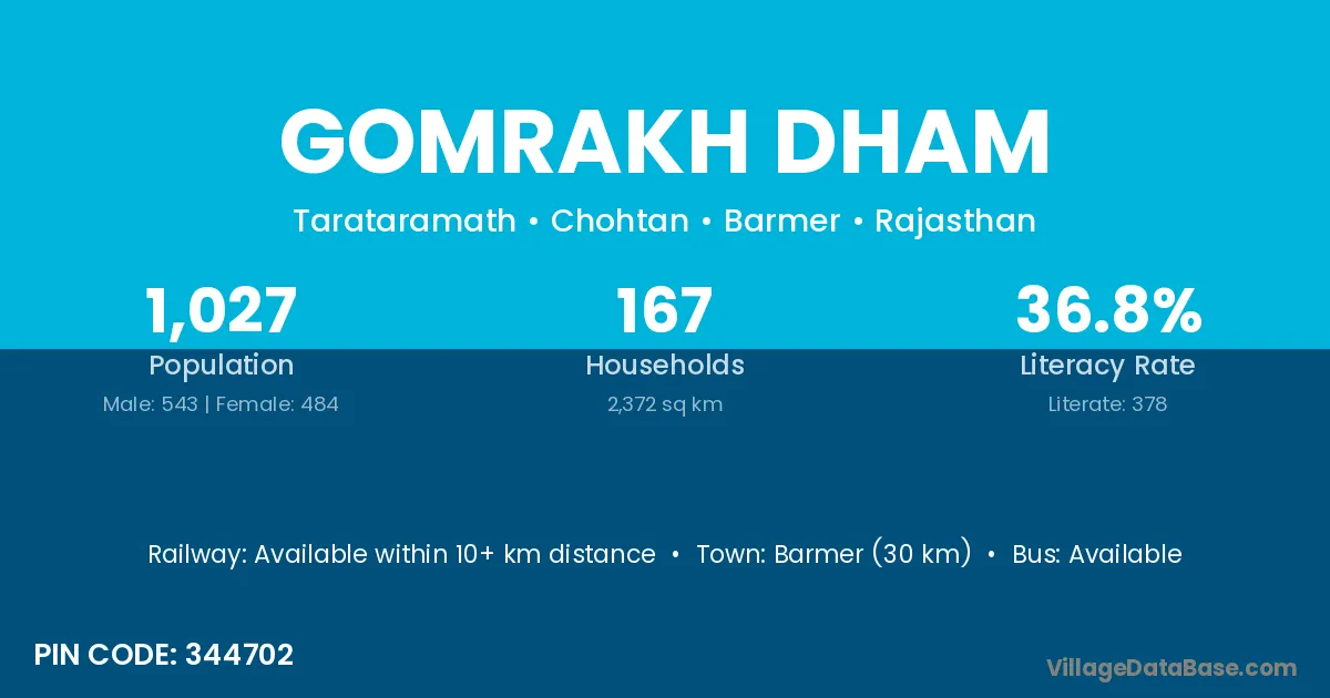 Barmer (30 km) is the nearest town to Gomrakh Dham village for major economic activities and is located approximately 30 km away.