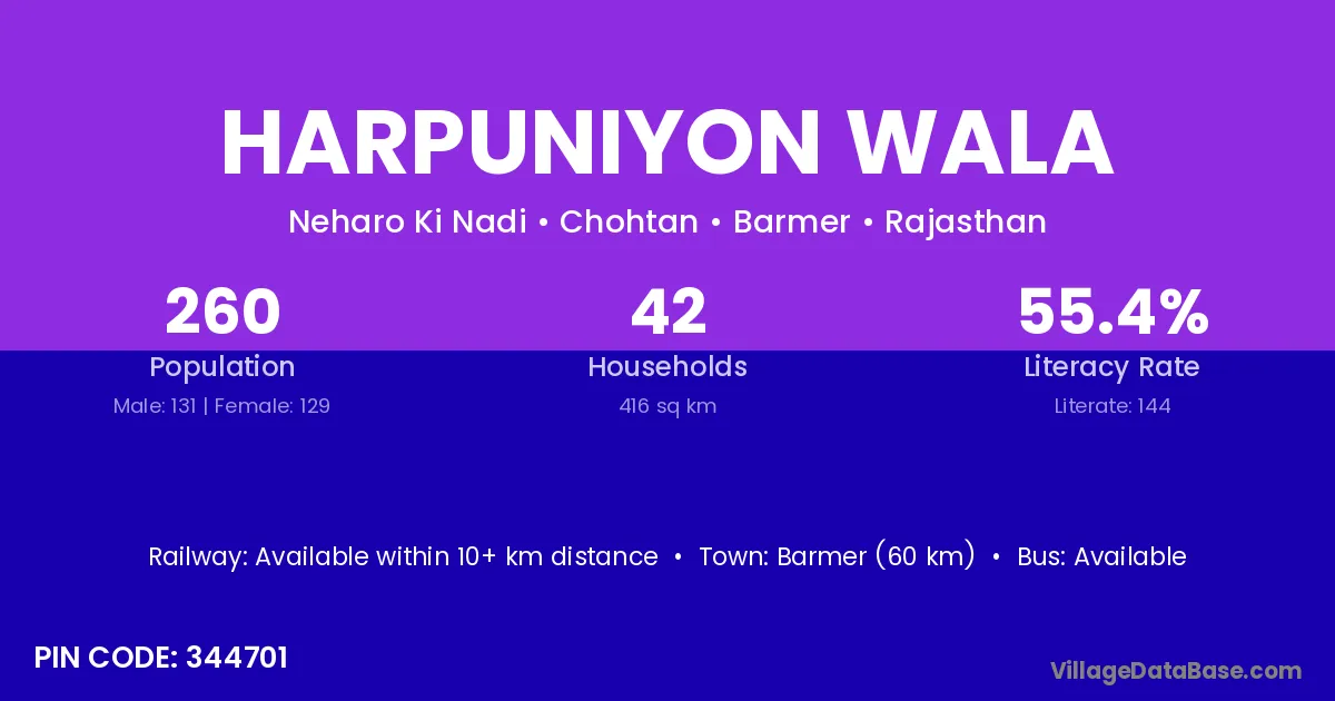 Barmer (60 km) is the nearest town to Harpuniyon Wala village for major economic activities and is located approximately 60 km away.