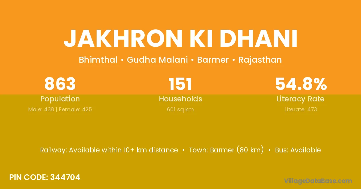 Barmer (90 km) is the nearest town to Jakhron Ki Dhani village for major economic activities and is located approximately 90 km away.