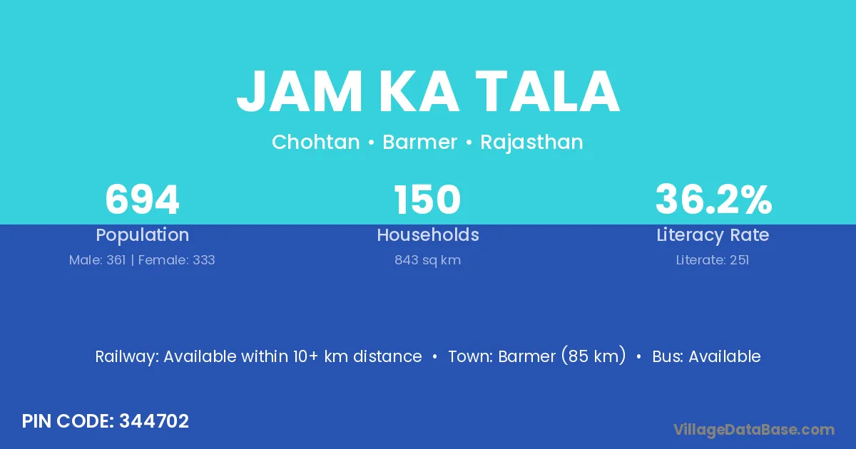 Barmer (85 km) is the nearest town to Jam Ka Tala village for major economic activities and is located approximately 85 km away.