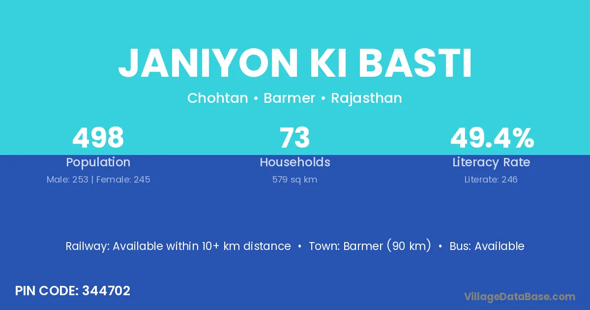 Janiyon Ki Basti village has a total population of 498 people, of which 253 are males and 245 are females.