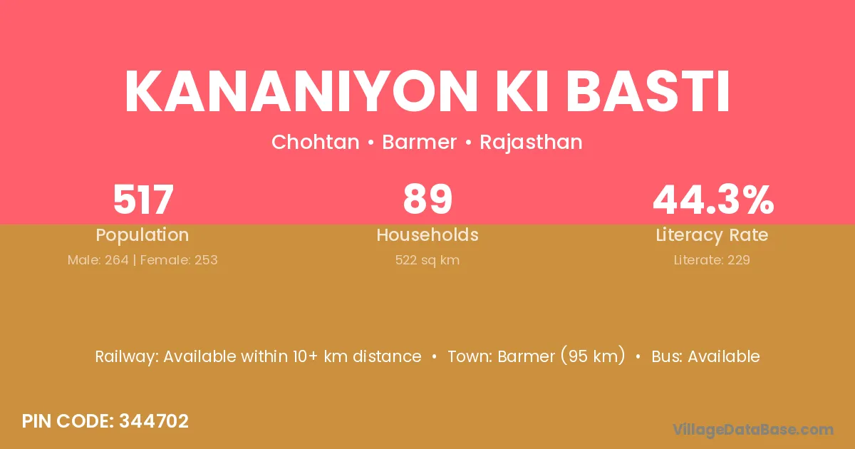 Kananiyon Ki Basti village has a total population of 517 people, of which 264 are males and 253 are females.