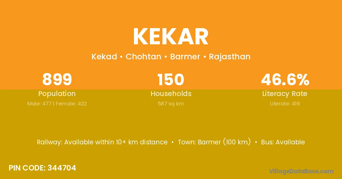 Barmer (100 km) is the nearest town to Kekar village for major economic activities and is located approximately 100 km away.