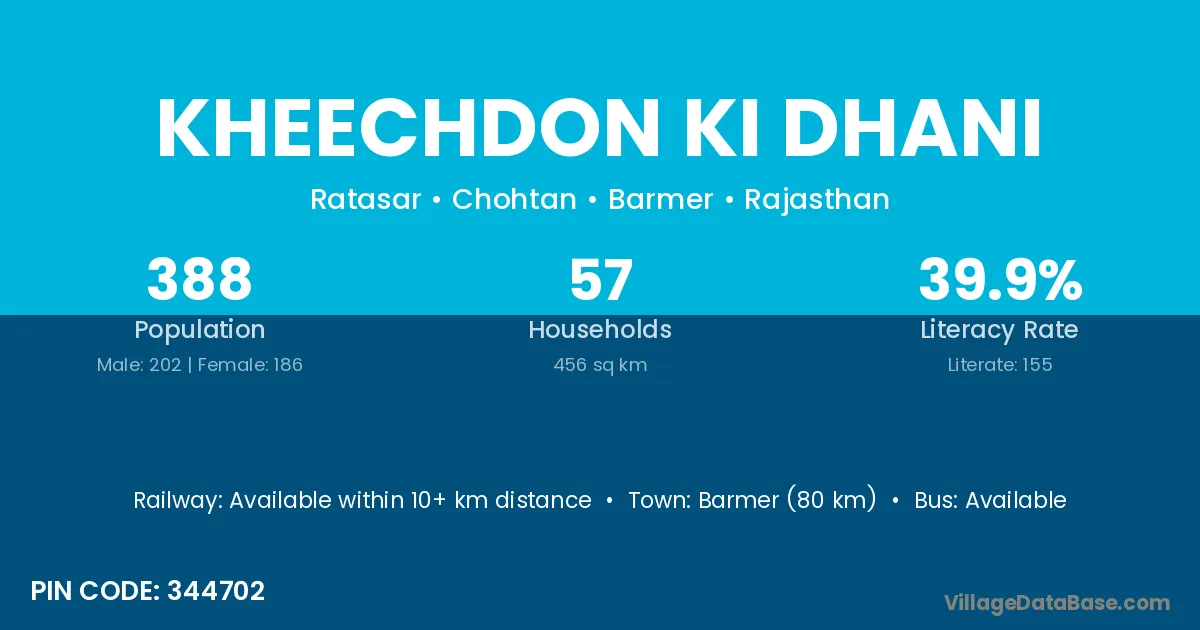 Kheechdon Ki Dhani village has a total population of 388 people, of which 202 are males and 186 are females.