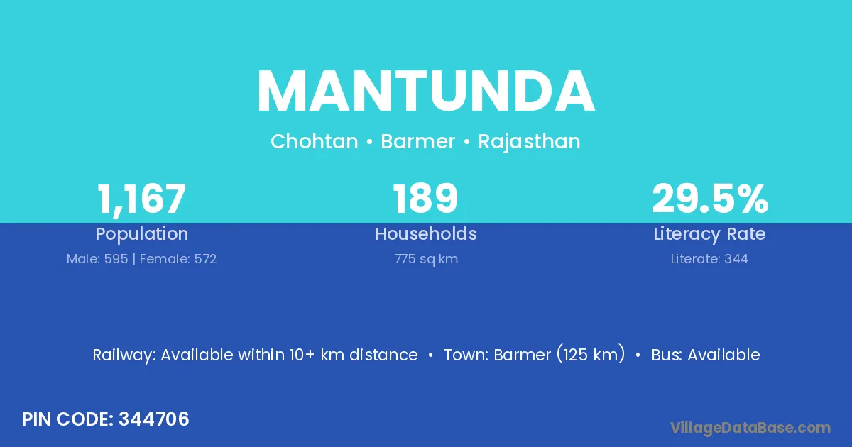 Barmer (125 km) is the nearest town to Mantunda village for major economic activities and is located approximately 125 km away.