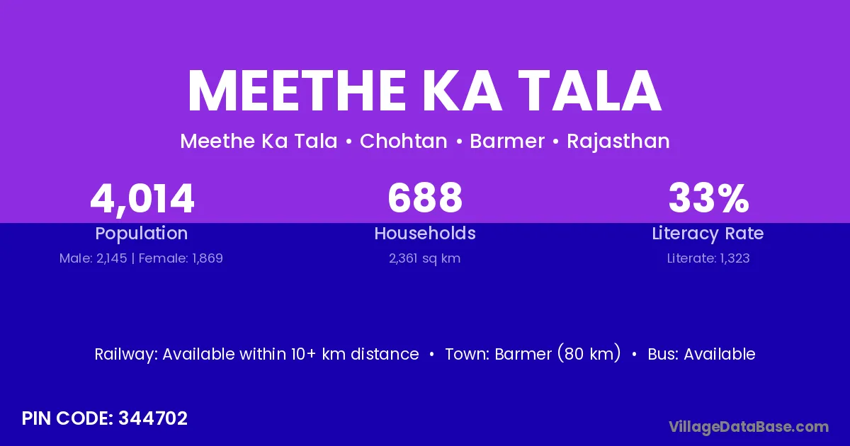Barmer (80 km) is the nearest town to Meethe Ka Tala village for major economic activities and is located approximately 80 km away.
