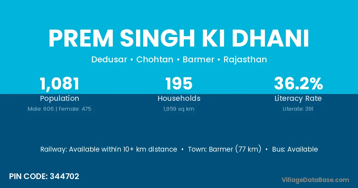 Barmer (77 km) is the nearest town to Prem Singh Ki Dhani village for major economic activities and is located approximately 77 km away.