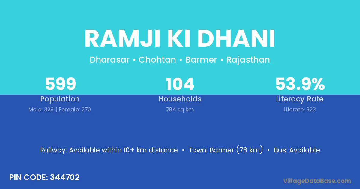 Barmer (76 km) is the nearest town to Ramji Ki Dhani village for major economic activities and is located approximately 76 km away.