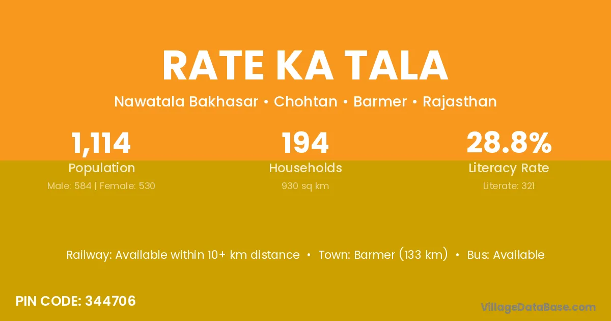 Rate Ka Tala village has a total population of 1,114 people, of which 584 are males and 530 are females.