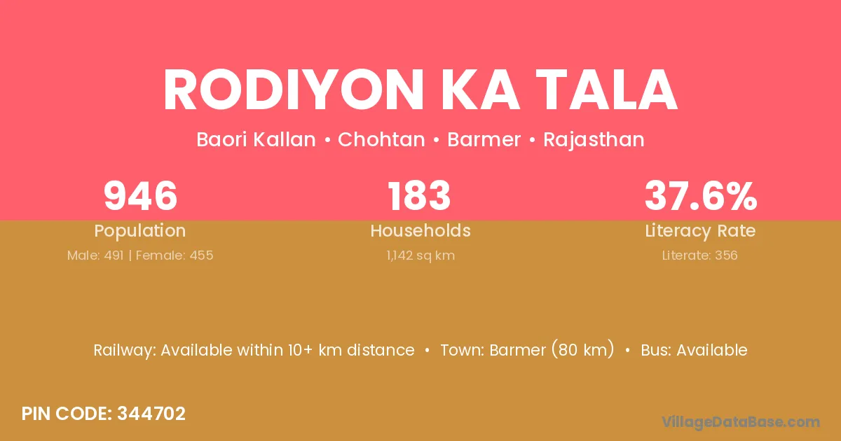 Rodiyon Ka Tala village has a total population of 946 people, of which 491 are males and 455 are females.