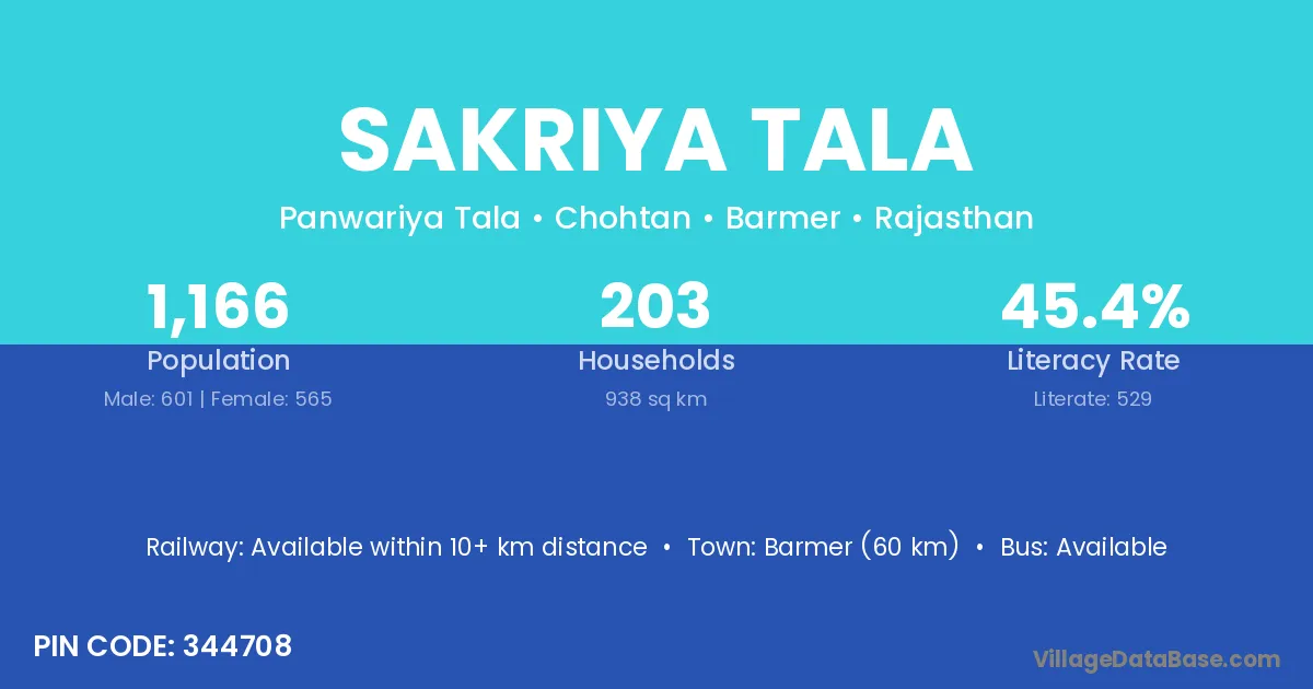 Barmer (60 km) is the nearest town to Sakriya Tala village for major economic activities and is located approximately 60 km away.
