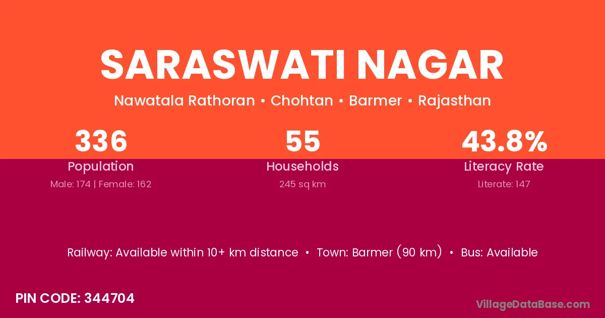 Barmer (90 km) is the nearest town to Saraswati Nagar village for major economic activities and is located approximately 90 km away.