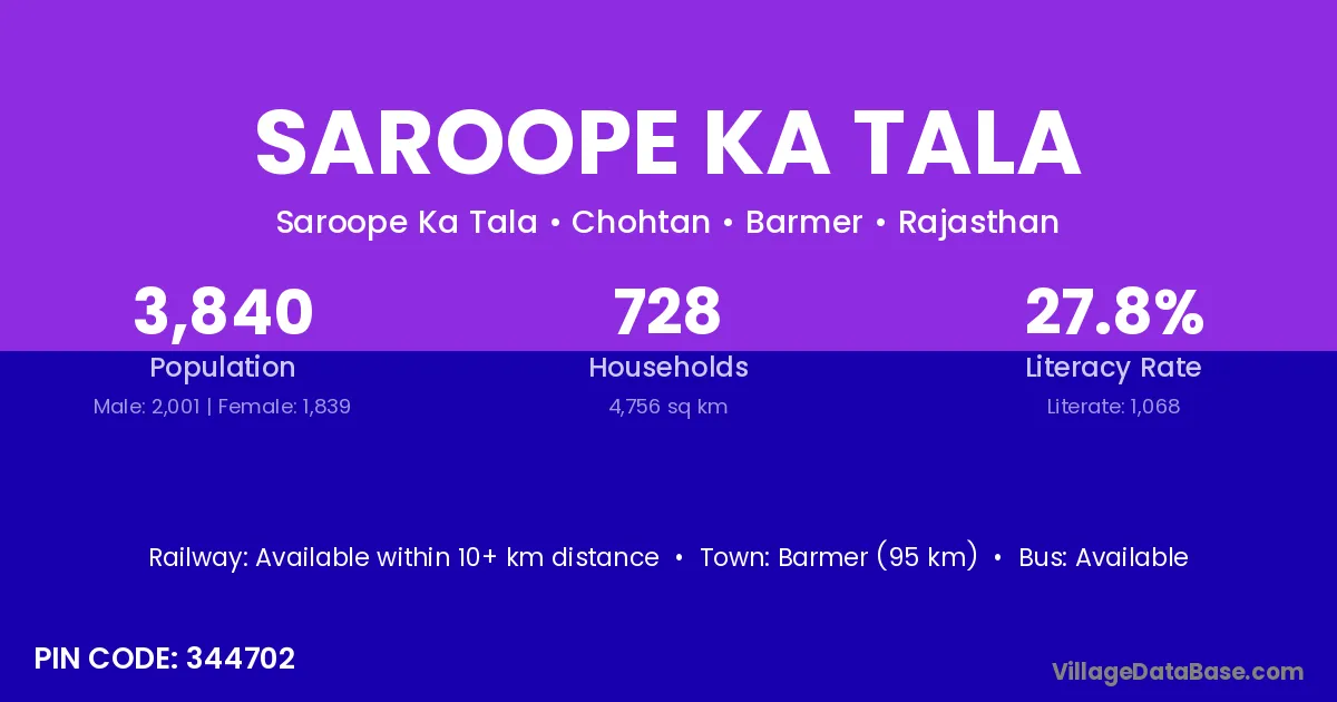 Barmer (95 km) is the nearest town to Saroope Ka Tala village for major economic activities and is located approximately 95 km away.
