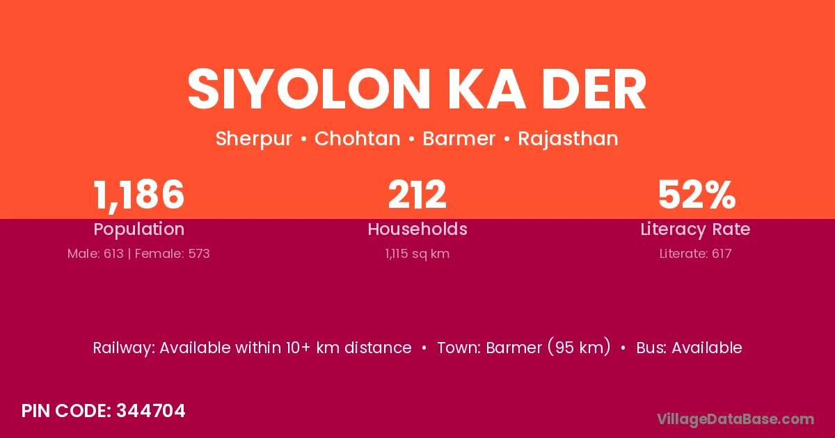 Siyolon Ka Der village has a total population of 1,186 people, of which 613 are males and 573 are females.