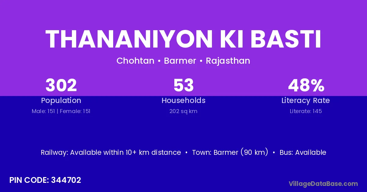 Barmer (90 km) is the nearest town to Thananiyon Ki Basti village for major economic activities and is located approximately 90 km away.
