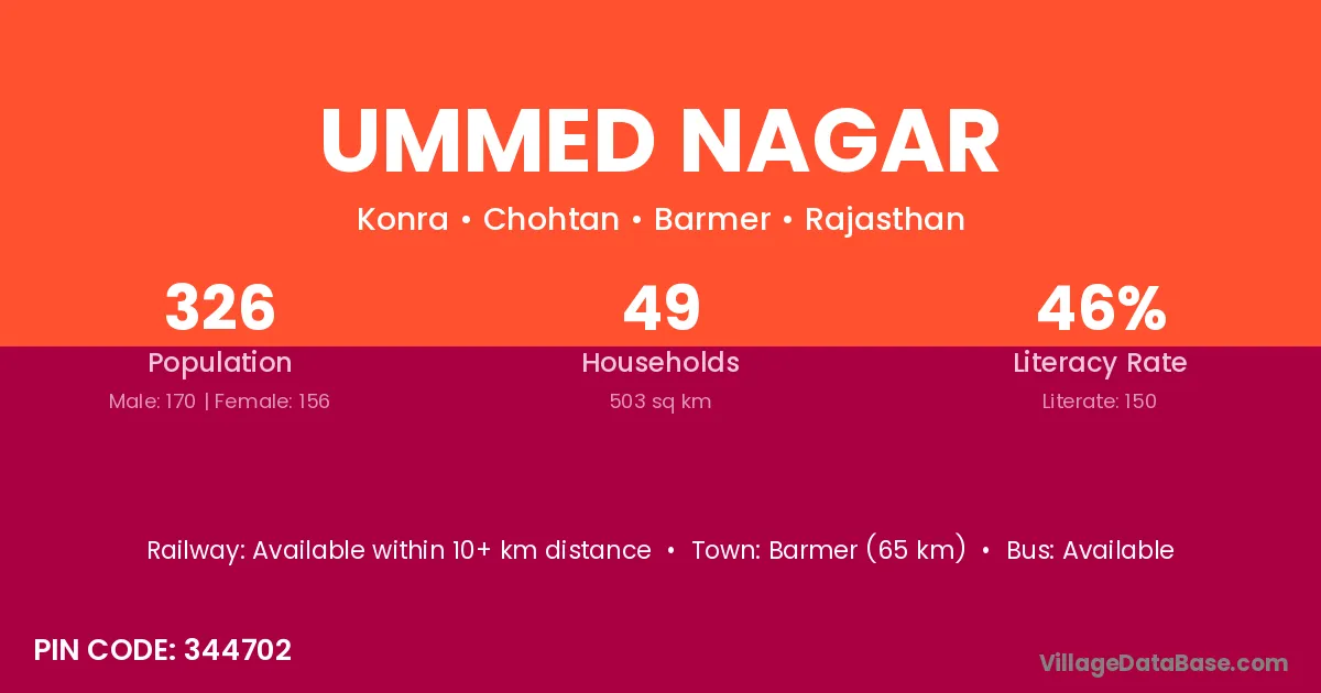 Barmer (65 km) is the nearest town to Ummed Nagar village for major economic activities and is located approximately 65 km away.