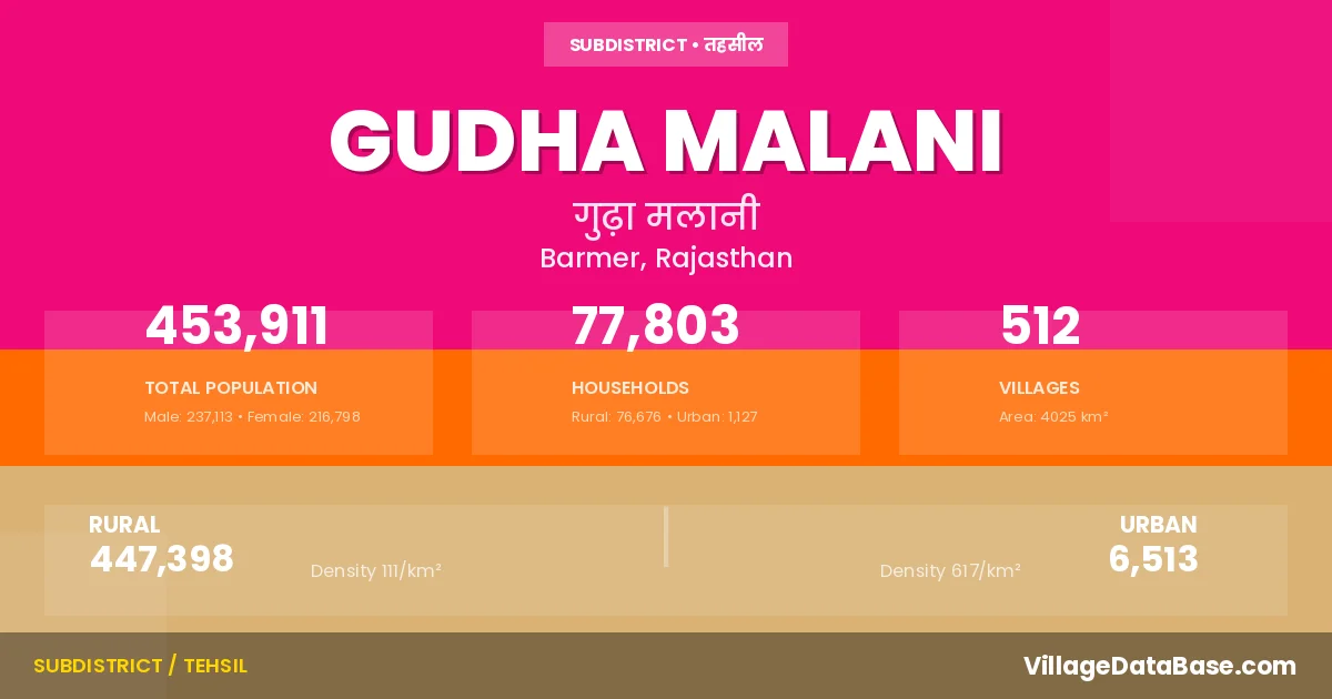 According to the 2011 census The total area of Gudha Malani Tehsil is 4025 km², with a population of 453911 people. The population density is 113 inhabitants per square kilometre, and there are approximately 77803 houses in the sub district.