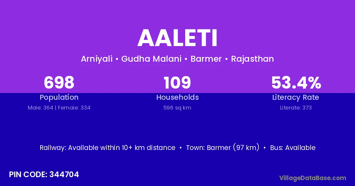 Barmer (97 km) is the nearest town to Aaleti village for major economic activities and is located approximately 97 km away.