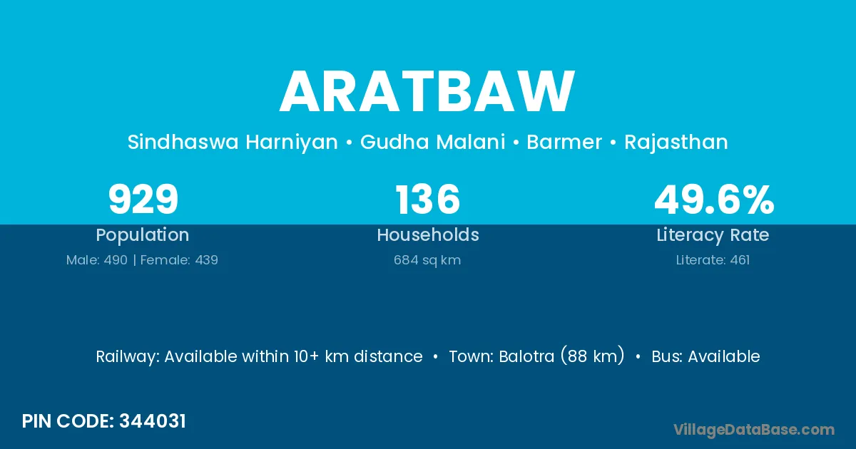 Balotra (88 km) is the nearest town to Aratbaw village for major economic activities and is located approximately 88 km away.