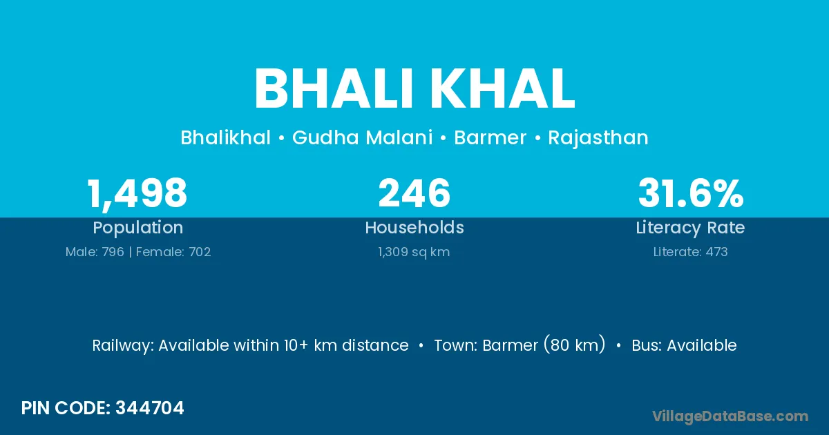 Barmer (80 km) is the nearest town to Bhali Khal village for major economic activities and is located approximately 80 km away.