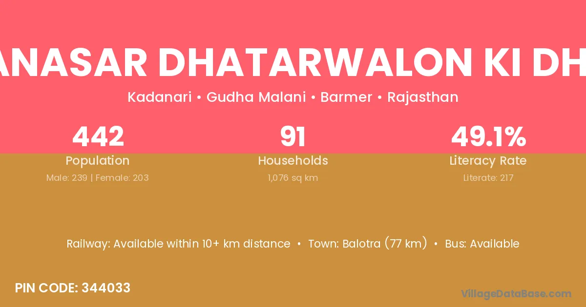 Bhanasar Dhatarwalon Ki Dhani village has a total population of 442 people, of which 239 are males and 203 are females.