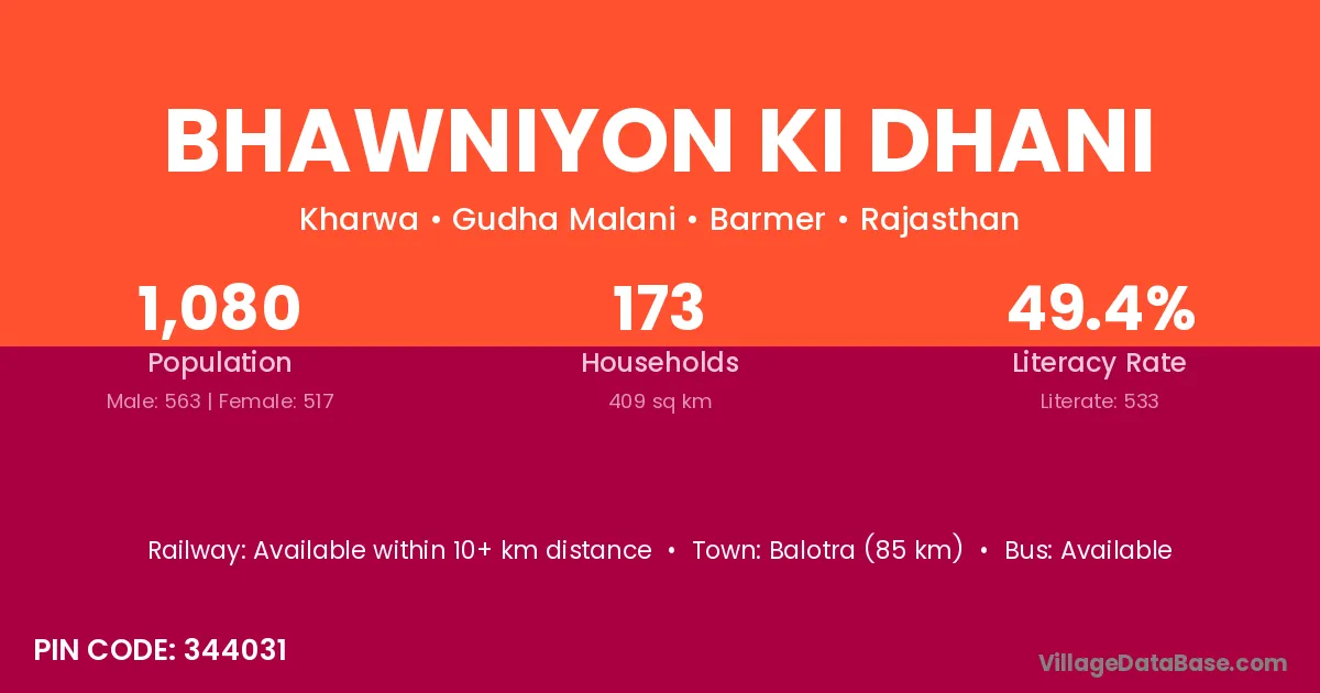 Bhawniyon Ki Dhani village has a total population of 1,080 people, of which 563 are males and 517 are females.