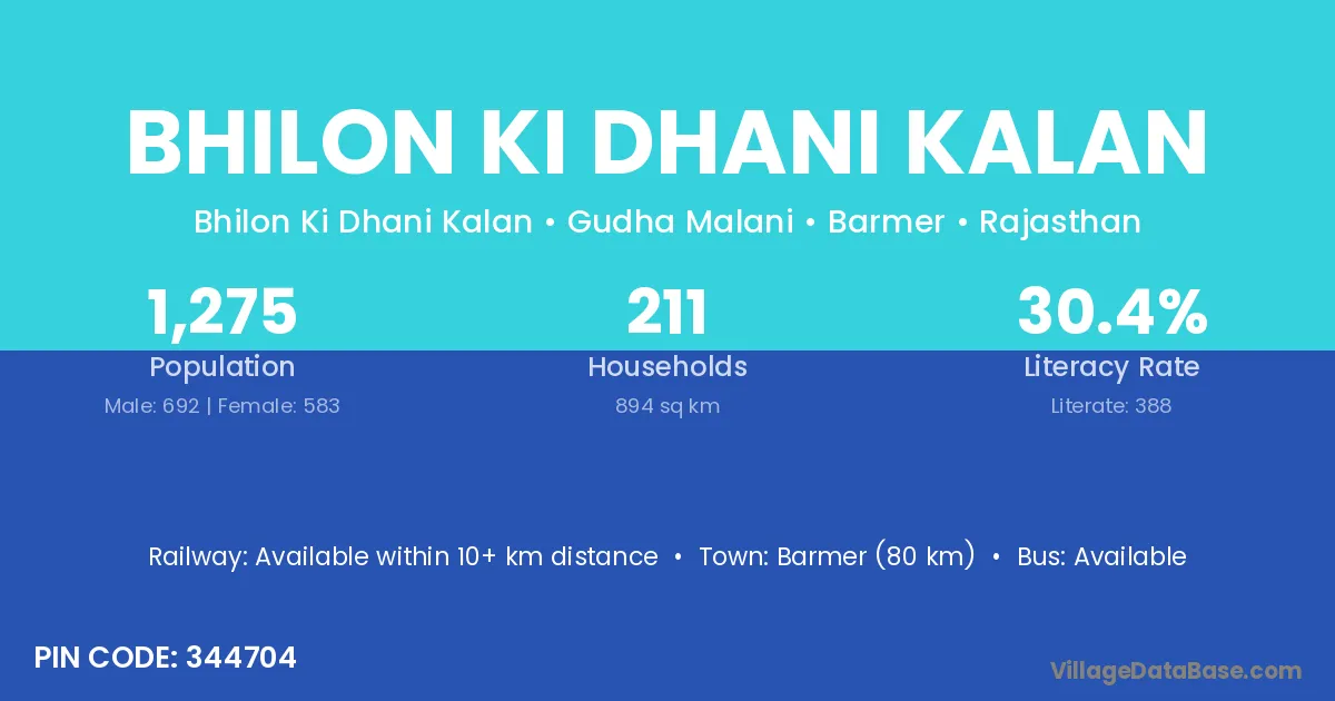 Barmer (80 km) is the nearest town to Bhilon Ki Dhani Kalan village for major economic activities and is located approximately 80 km away.