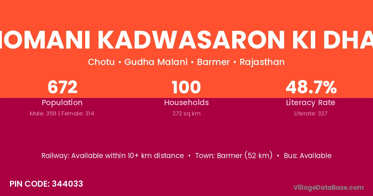 Bhomani Kadwasaron Ki Dhani village has a total population of 672 people, of which 358 are males and 314 are females.