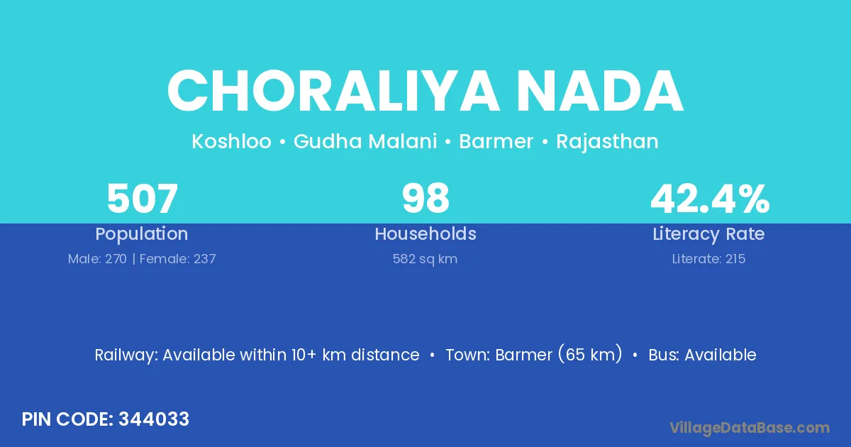 Barmer (65 km) is the nearest town to Choraliya Nada village for major economic activities and is located approximately 65 km away.