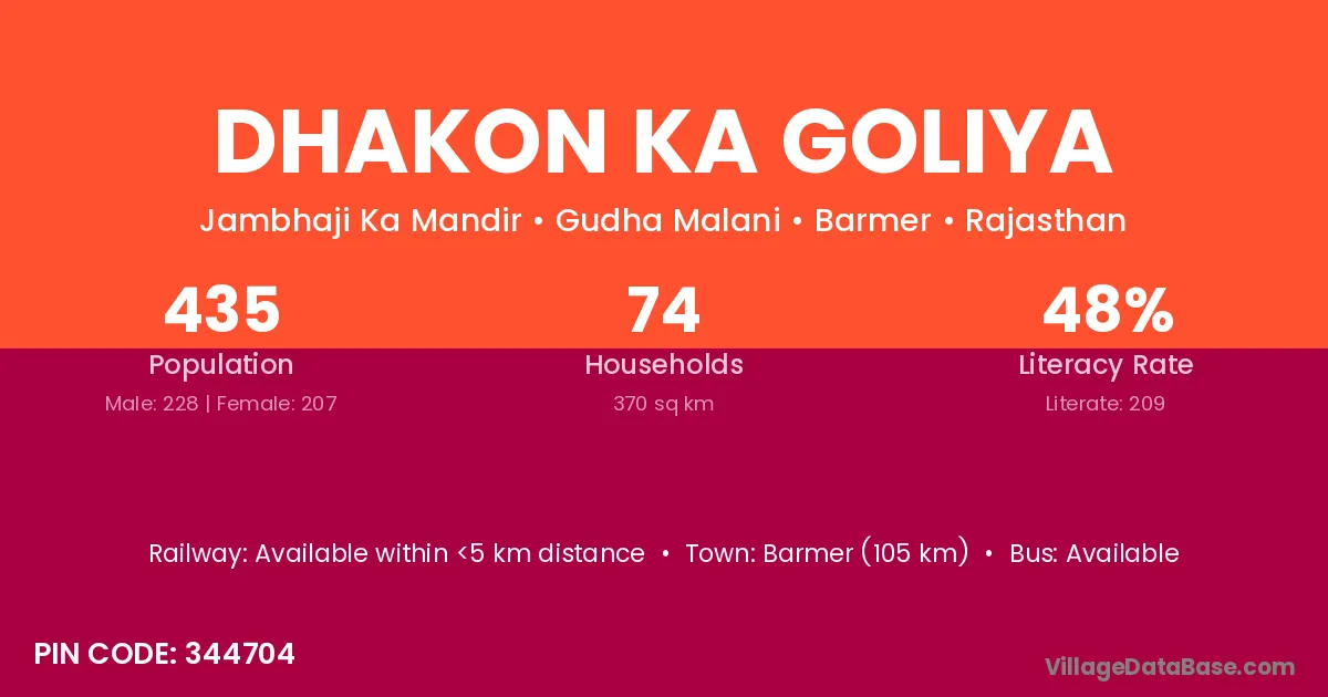 Barmer (105 km) is the nearest town to Dhakon Ka Goliya village for major economic activities and is located approximately 105 km away.
