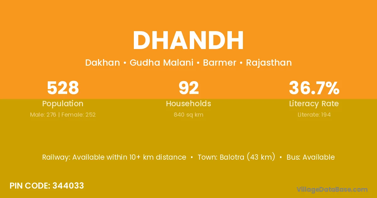 Balotra (43 km) is the nearest town to Dhandh village for major economic activities and is located approximately 43 km away.