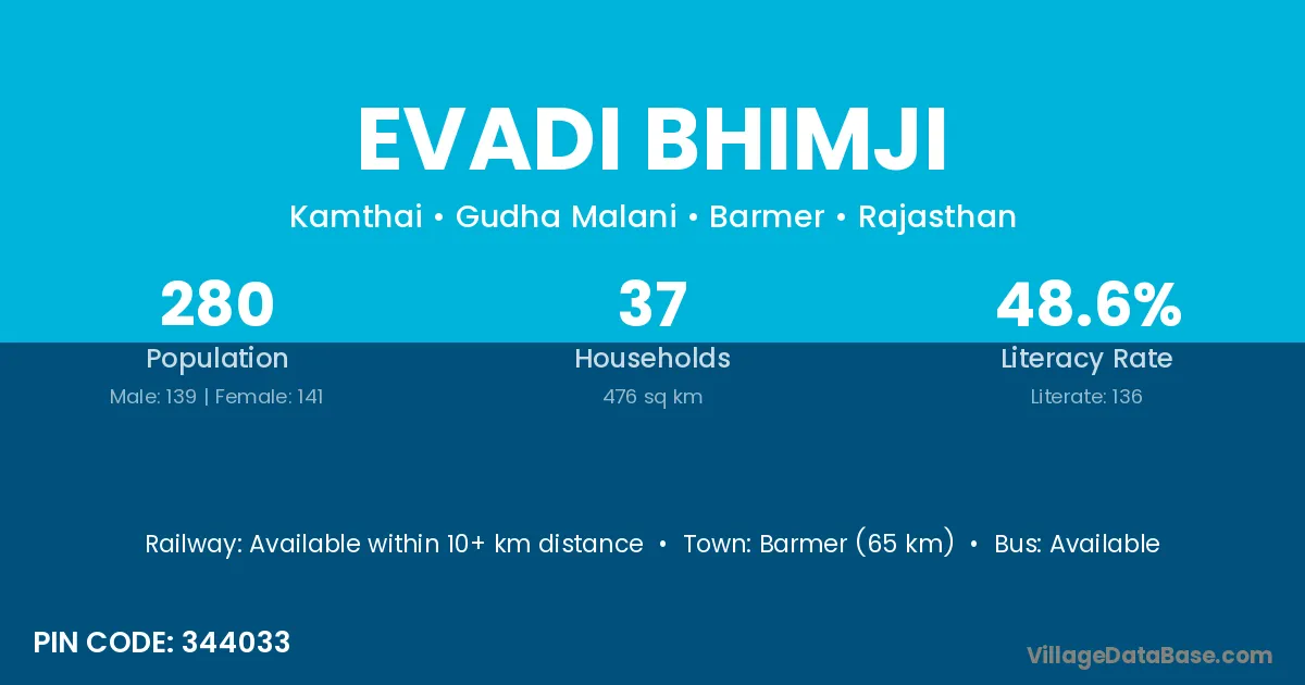 Barmer (65 km) is the nearest town to Evadi Bhimji village for major economic activities and is located approximately 65 km away.