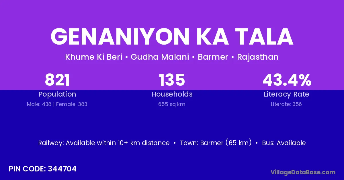 Barmer (65 km) is the nearest town to Genaniyon Ka Tala village for major economic activities and is located approximately 65 km away.