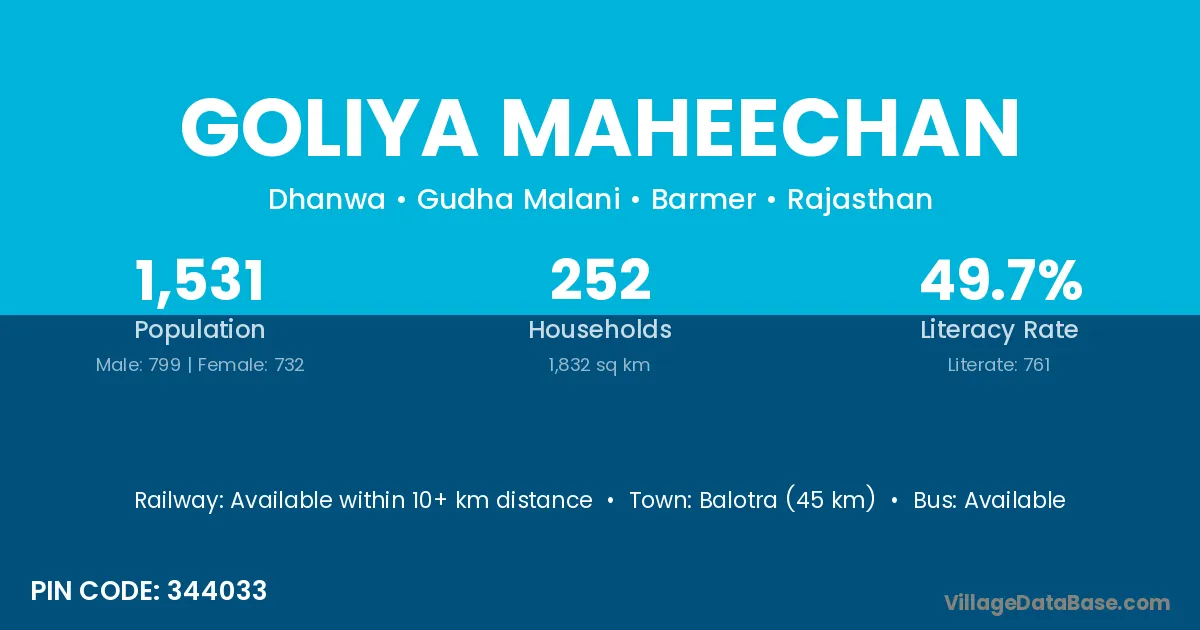 Balotra (45 km) is the nearest town to Goliya Maheechan village for major economic activities and is located approximately 45 km away.