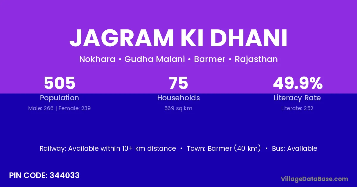 Jagram Ki Dhani village has a total population of 505 people, of which 266 are males and 239 are females.