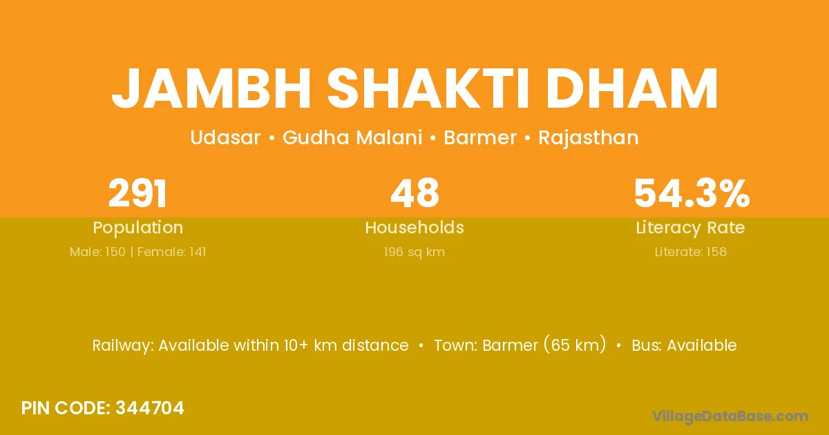 Barmer (65 km) is the nearest town to Jambh Shakti Dham village for major economic activities and is located approximately 65 km away.