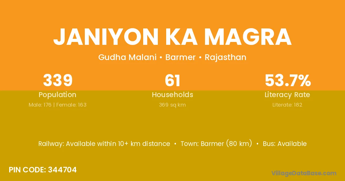 Barmer (80 km) is the nearest town to Janiyon Ka Magra village for major economic activities and is located approximately 80 km away.