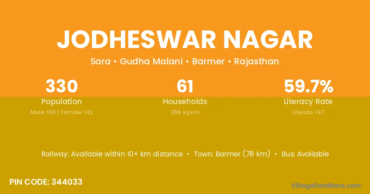Jodheswar Nagar village has a total population of 330 people, of which 188 are males and 142 are females.