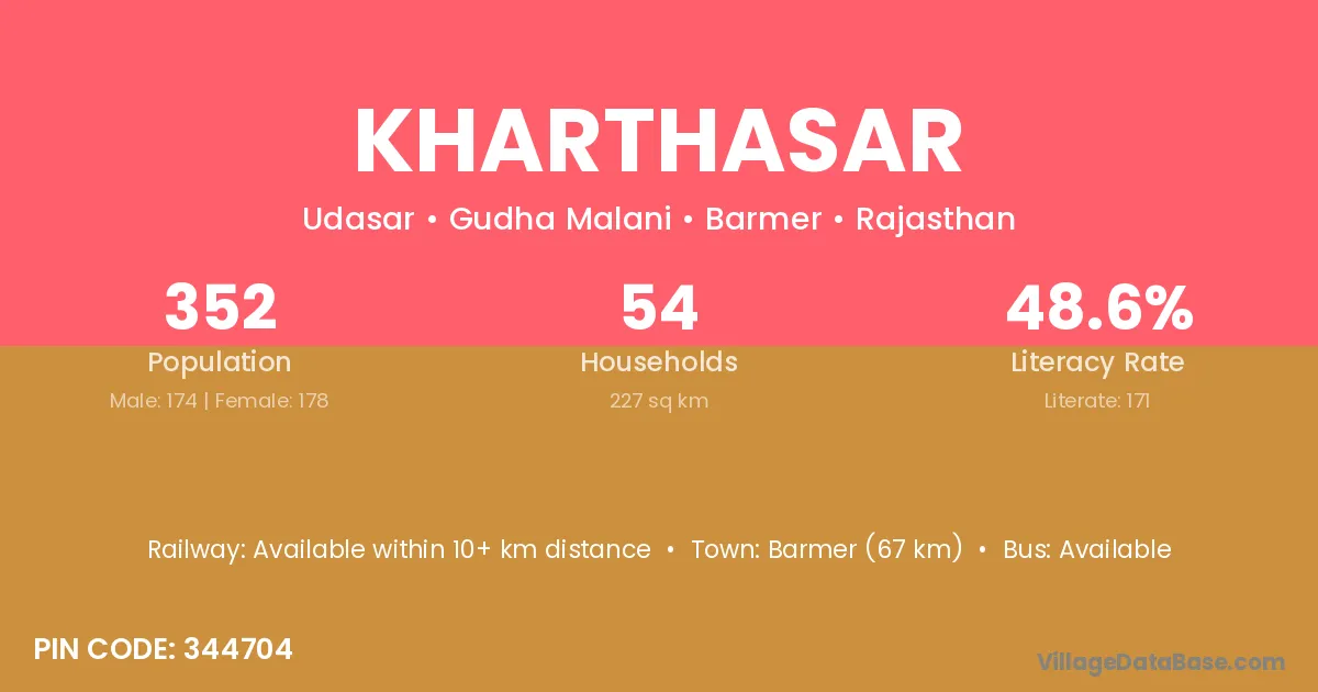 Kharthasar village has a total population of 352 people, of which 174 are males and 178 are females.