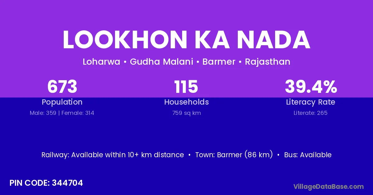 Barmer (86 km) is the nearest town to Lookhon Ka Nada village for major economic activities and is located approximately 86 km away.