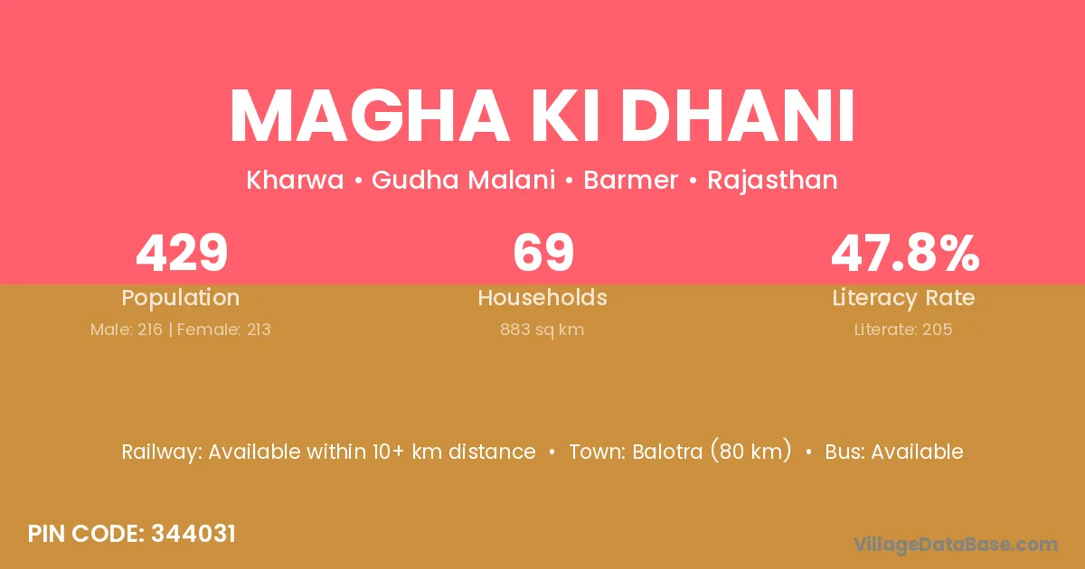 Balotra (80 km) is the nearest town to Magha Ki Dhani village for major economic activities and is located approximately 80 km away.