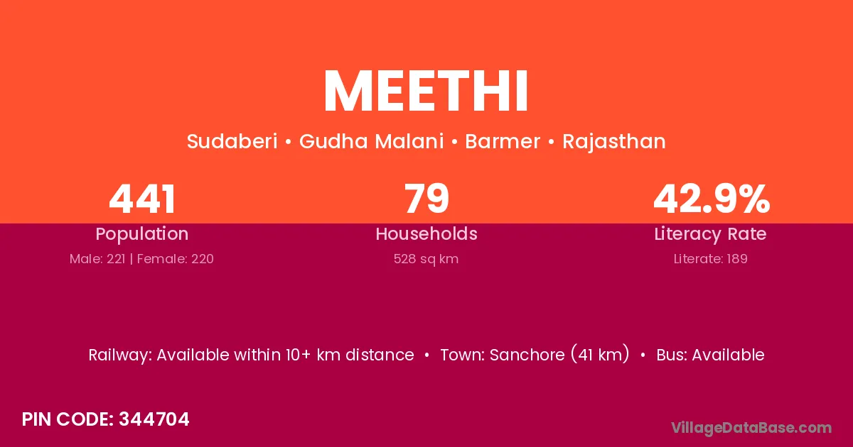 Sanchore (41 km) is the nearest town to Meethi village for major economic activities and is located approximately 41 km away.