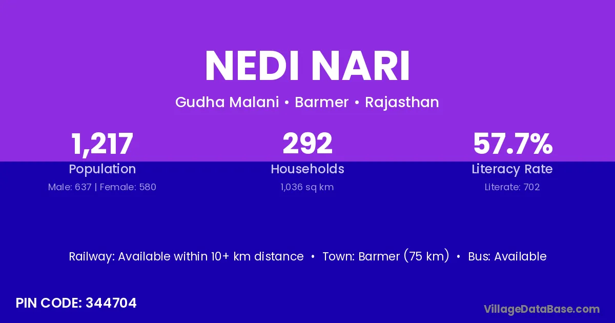 Barmer (75 km) is the nearest town to Nedi Nari village for major economic activities and is located approximately 75 km away.