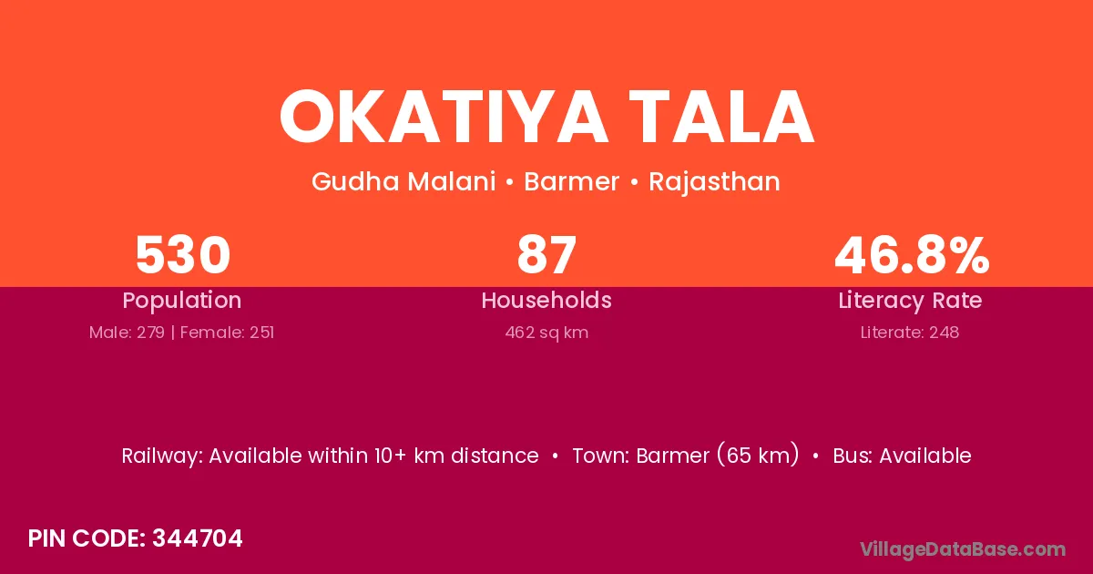 Barmer (65 km) is the nearest town to Okatiya Tala village for major economic activities and is located approximately 65 km away.
