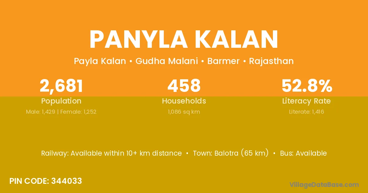 Balotra (65 km) is the nearest town to Panyla Kalan village for major economic activities and is located approximately 65 km away.