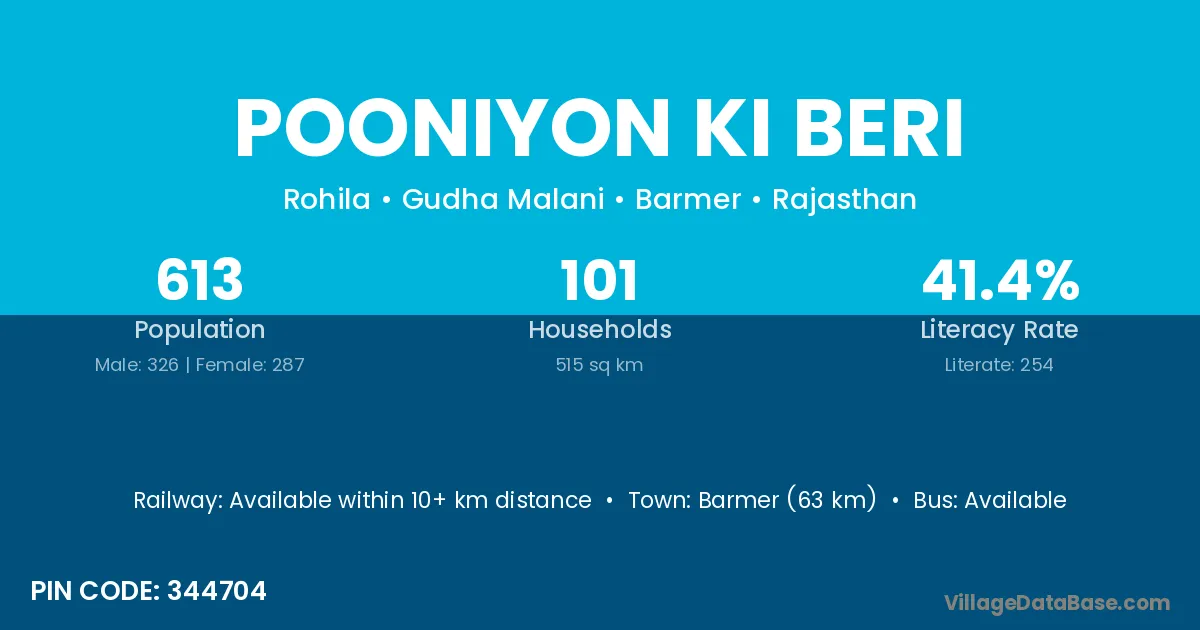 Barmer (63 km) is the nearest town to Pooniyon Ki Beri village for major economic activities and is located approximately 63 km away.
