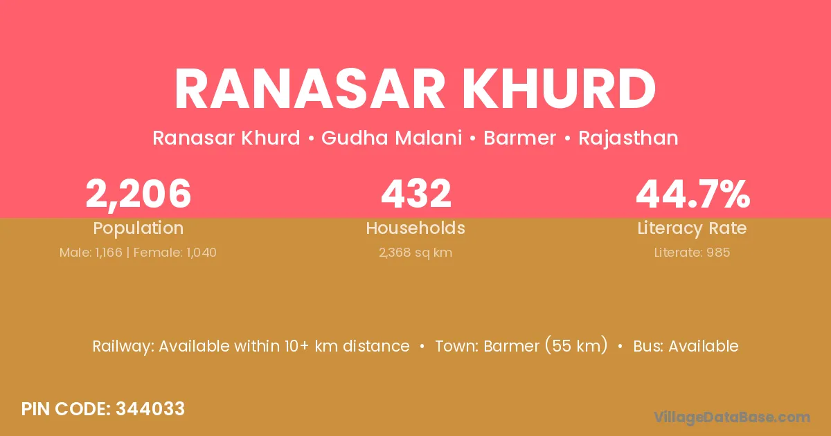 Barmer (55 km) is the nearest town to Ranasar Khurd village for major economic activities and is located approximately 55 km away.