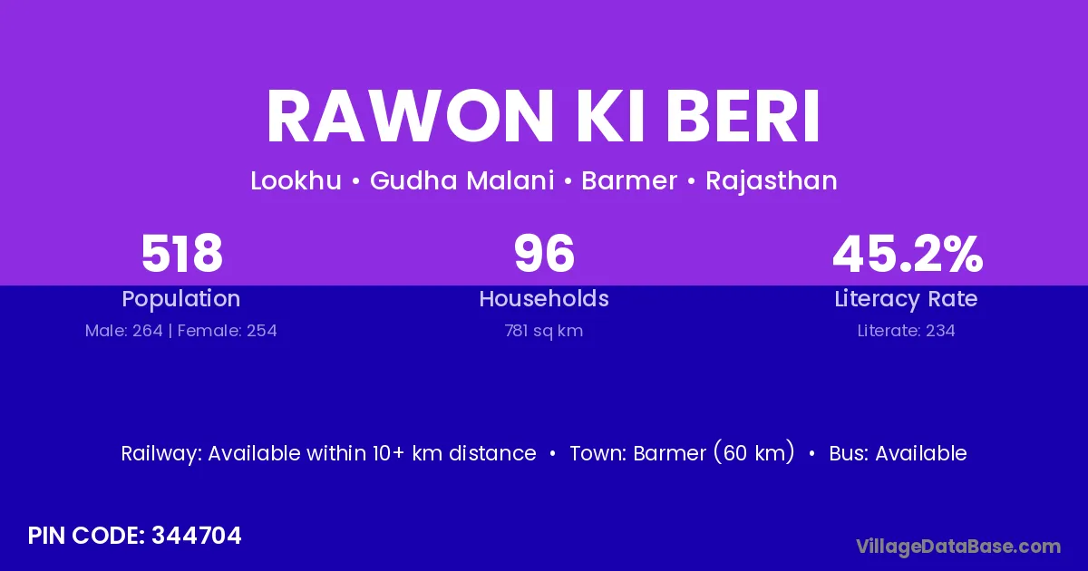 Barmer (60 km) is the nearest town to Rawon Ki Beri village for major economic activities and is located approximately 60 km away.