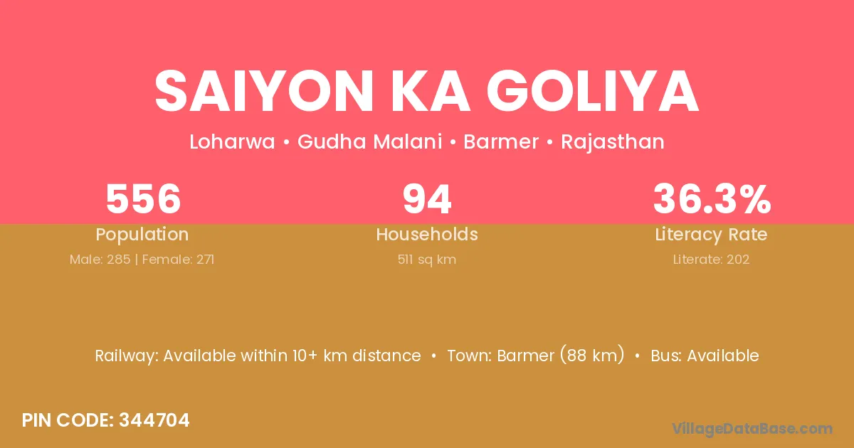 Barmer (88 km) is the nearest town to Saiyon Ka Goliya village for major economic activities and is located approximately 88 km away.