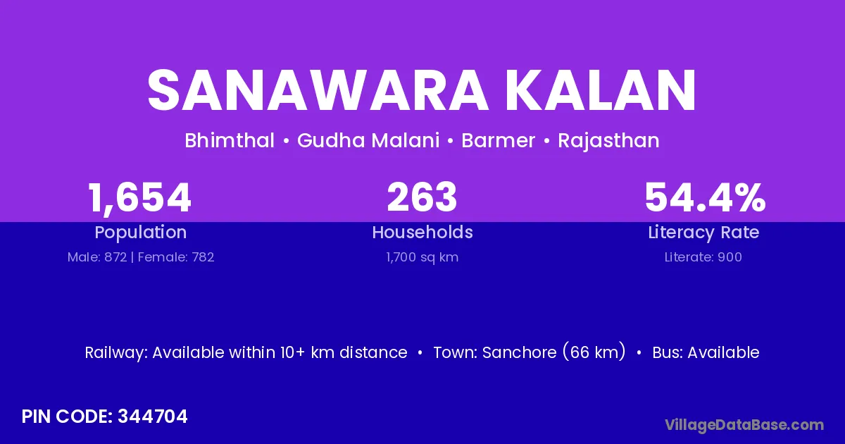 Sanchore (66 km) is the nearest town to Sanawara Kalan village for major economic activities and is located approximately 66 km away.